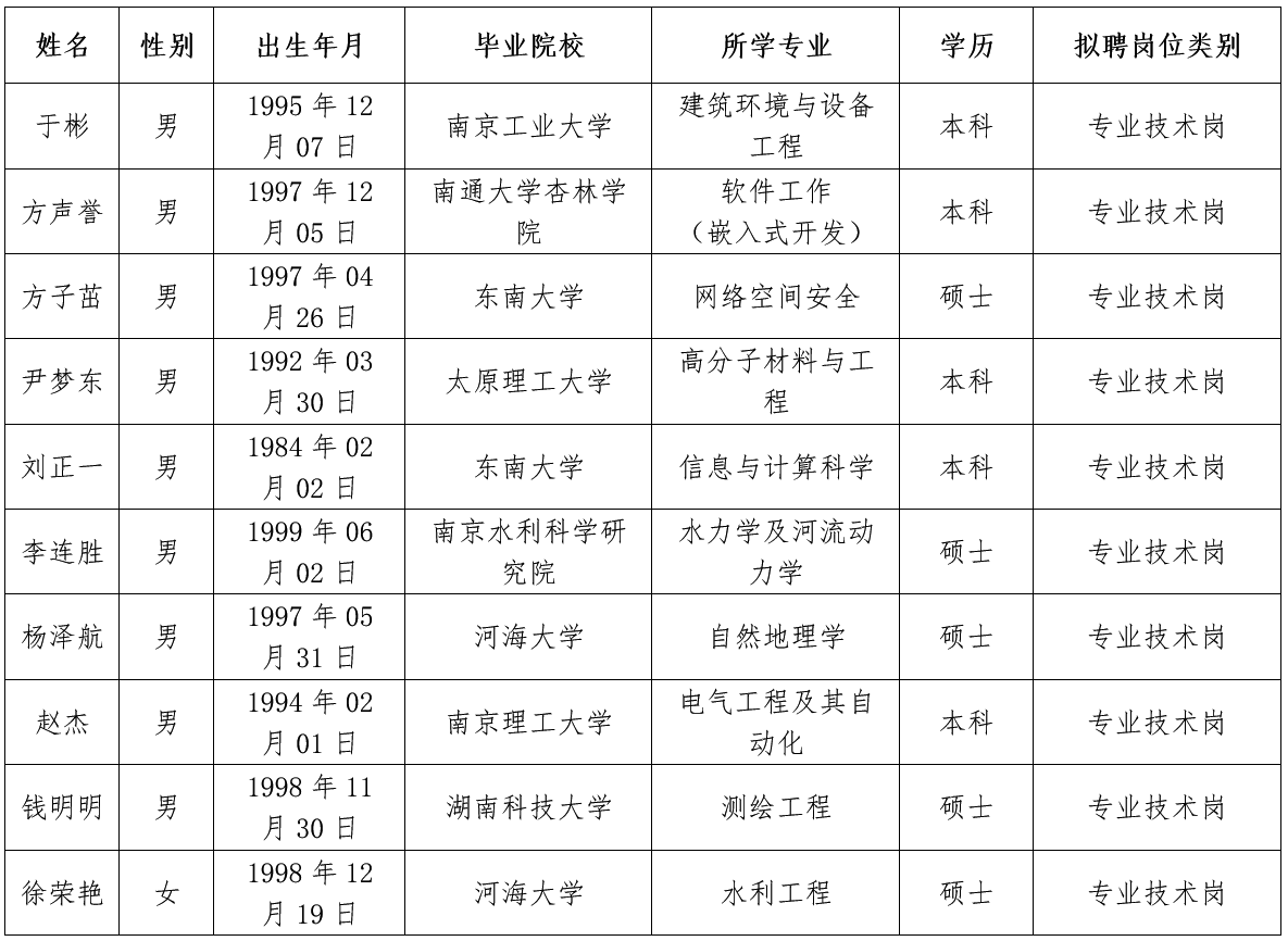 根據(jù)公開招聘工作有關要求,經(jīng)過報名、資格審核、面試、體檢等程序,確定于彬等10人為南京瑞迪水利信息科技有限公司擬錄用人員(按姓氏筆畫排序),具體如下: