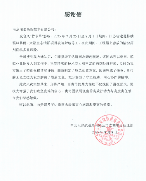 近日,南京瑞迪高新技術有限公司(以下簡稱“瑞迪高新”)收到中交天航局太湖生態清淤項目部發來的感謝信,對公司在臺風“竹節草”侵襲期間的緊急馳援表達誠摯謝意。